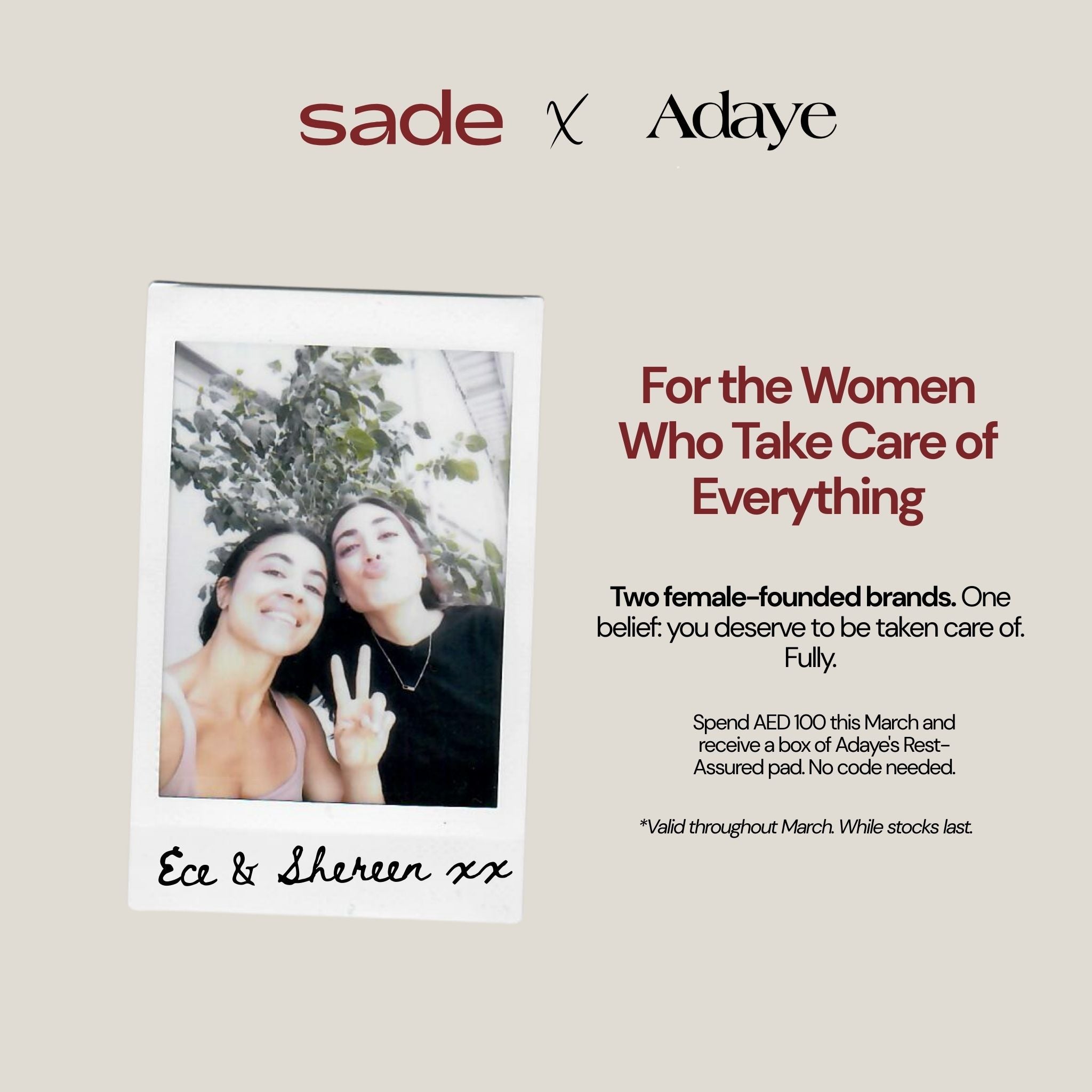 For the whole month of March, spend AED 100 on Sade and receive a complimentary Adaye's Rest-Assured pad on us.